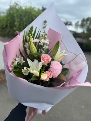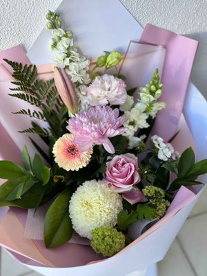 Crisp fresh soft pink toned mixed flower bouquet. Hand tied bouquet and ready to be placed into a vase.