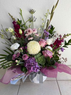 A lovely design presented in a Hat Box container - ideal to just be placed and enjoyed. Colours and styles can vary - choice, select blooms and a colourful display - three sizes to choose from