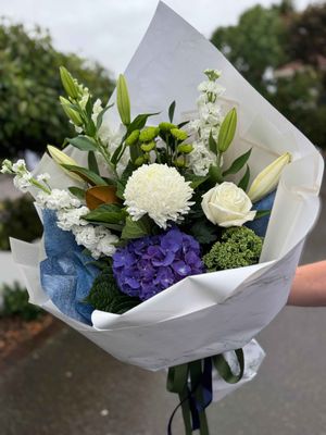 A Simple soft styled cut flower bouquet for the arrival of a wee baby - colours can be pinks blues or naturals, Suits all lovers of soft pretty flowers