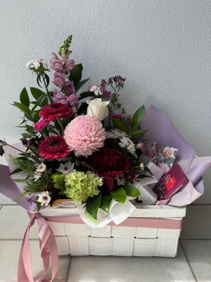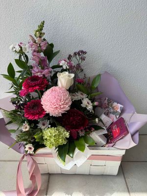 Gift Basket of fresh Summery floral blooms = Mini Brownie bite, Fruney Chocolate tablet, Tray of Tamara Shower bombs and Green Tea face mask OR bath Salt sachet. Beautifully Presented and ready to enjoy