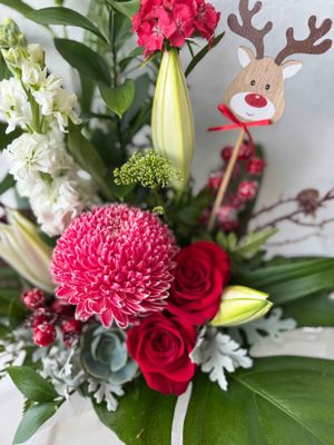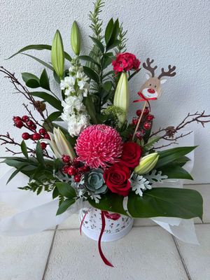 this lovely fish Christmas floral Hat box has Xmas touches - twigs berry and a Reindeer pick. Lovely to dress the house for Xmas