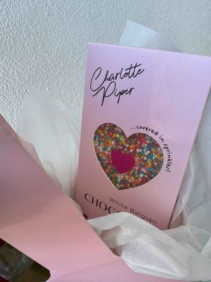 Gorgeous Carry Box with a lovely arrangement in a Glass mini Bottle, Come with a wooden "Love you Heart" and Charlotte Piper Block of Chocolate to match.