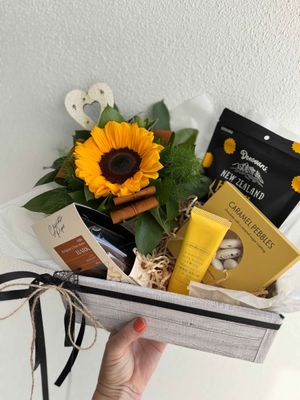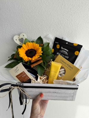 This lovely Gift Box Has a potted Sunflower. Biscoff chocolate bark, Caramel pebbles, Hokey Pokey Clusters and a cute lemon hand creme -