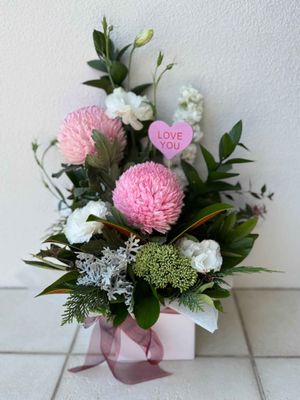 Lovely Floral Box with a Love you stake. Cute as a button. Team it with your choice or Chocolate, Handcreme or gifts and we can present it together.